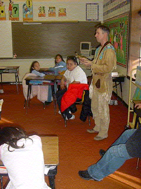Joe Chizek visited the fourth grade Wyoming history class dressed in period Mountain Man clothing. Authenic articles used by the mountain men during the fur trapping days were explained and demonstrated. |
